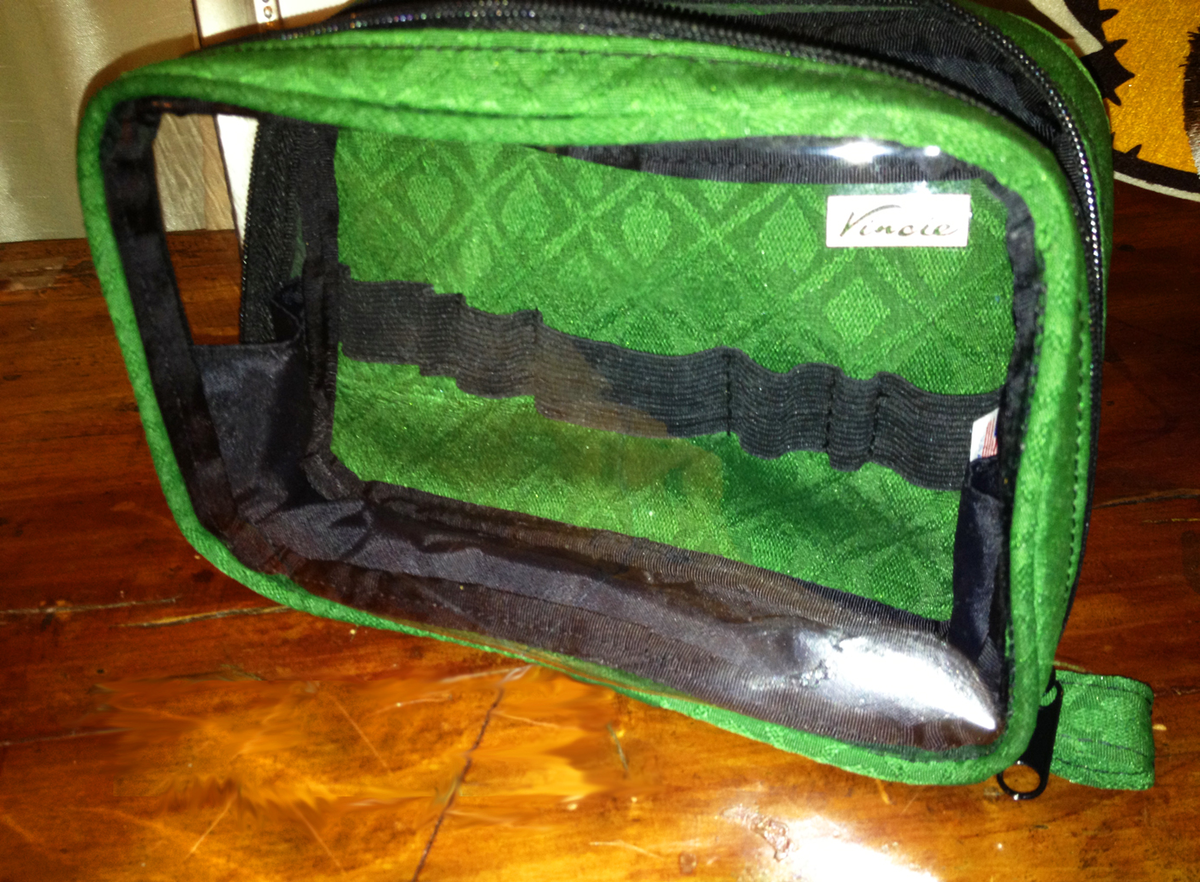 Custom poker-table green-on-green jacquard with hearts, diamonds, spades & clubs. Optional clear vinyl side. Lined with black poly denier. Classy bag with a hint of bad-boy gambler aesthetic. Handsome toiletries pouch for men or women.