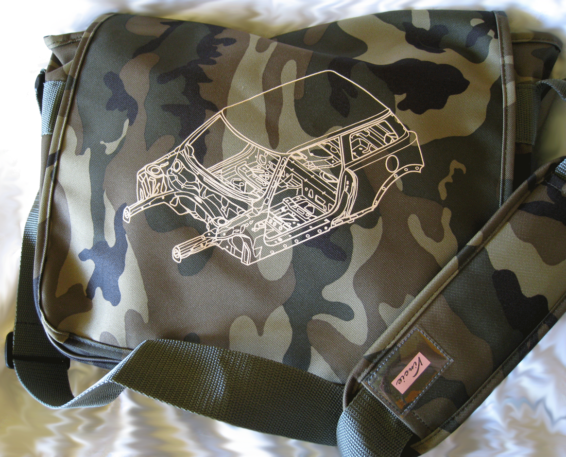 Signed by designer Vince Blaskovich. Made to honour workers on the MINI Cooper production line at Plant Oxford – they use it as a commuter bag. Designed in San Francisco, manufactured in Santa Ana. Silkscreened from drawings by Shannon Lucier of MINI Cooper Coupé or Cabrio subframe.