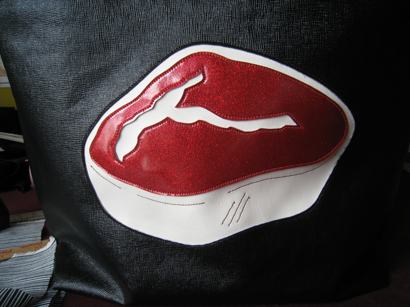 Textured, industrial-weight Landau vinyl outside :: Appliqué & top-stitch design :: Dual nylon straps :: Lined in cotton ticking, 6 pockets.